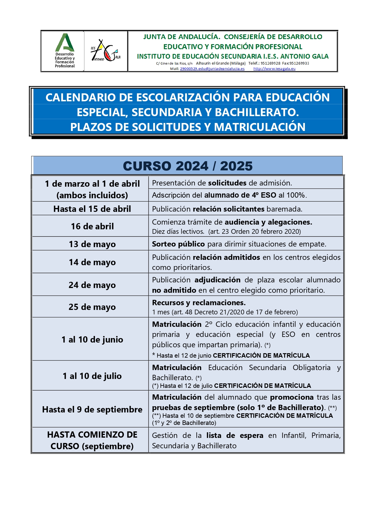Escolarización I.E.S Antonio Gala